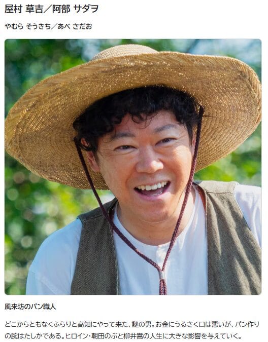 ドラマ『あんぱん』に登場する屋村草吉(ヤムおじさん)は、どこからともなく高知にふらりと現れた謎の男性です。口は悪くお金にはシビアながらも、パン作りの腕は確かで、ヒロイン・朝田のぶや柳井嵩の人生に深く関わっていく重要な人物として描かれています。
