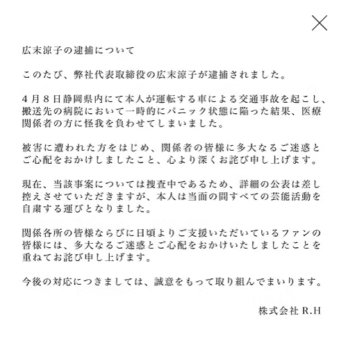 - 広末さんが代表を務める事務所は、公式サイトで謝罪を掲載し、芸能活動の自粛を報告。
