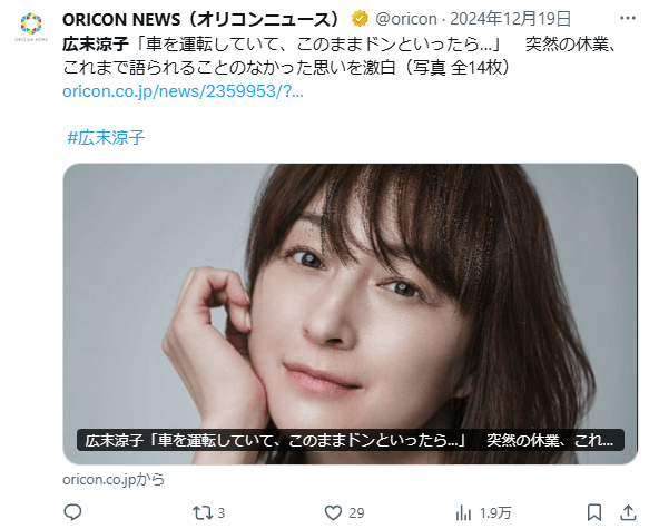 2024年12月のインタビューでは、広末容疑者が過去に精神的な負担を感じていたことや、「運転してこのままドンって行ったら、ちょっと病院で寝られるかな、みたいなことがよぎるくらい…」と語っていたことも報じられており、今回の行動との関連が注目されています。