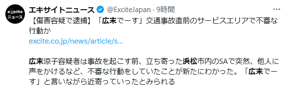 事故直前には、広末容疑者が立ち寄った浜松サービスエリアで、自らの名前を名乗りながら利用者に声をかけるなど、不審な言動も確認されていました。