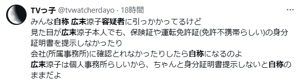 - 身元確認の混乱:「自称・広末涼子」として一時報道されたが、逮捕時に免許証を所持していなかったため。