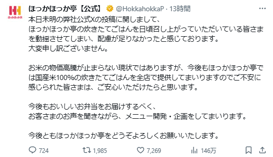 また、「ライスの代わりといってはなんですが、おかずトリオやオードブルを購入いただけますと幸甚です」と他商品のPRも行い、「今後は、このような事態が発生しないように、より一層運用体制の強化に努めてまいります」と締めくくりました。