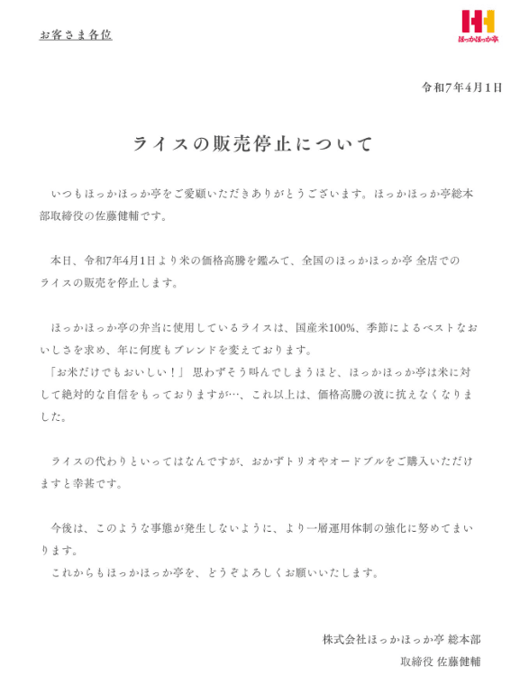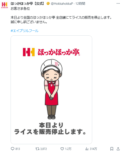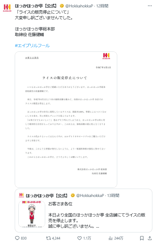 ライス販売停止のエイプリルフール投稿が物議を醸す中、ほっかほっか亭の取締役による「お客さま各位」という形で、さらなるネタ投稿が行われました。