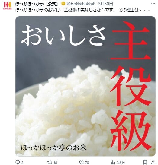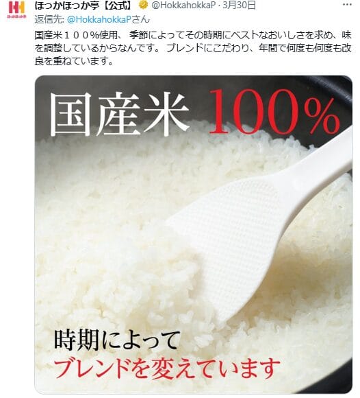 投稿では「本日、令和7年4月1日より米の価格高騰を鑑みて、全国のほっかほっか亭 全店でのライスの販売を停止します。」と改めて“公式風”に伝えつつ、「ほっかほっか亭の弁当に使用しているライスは、国産米100%、季節によるベストなおいしさを求め、年に何度もブレンドを変えております。」と自社のごはんへのこだわりをユーモアを交えて宣伝したあと、「価格高騰の波に抗えなくなりました」と、昨今の米の値上がりに絡めた“事情”を説明。