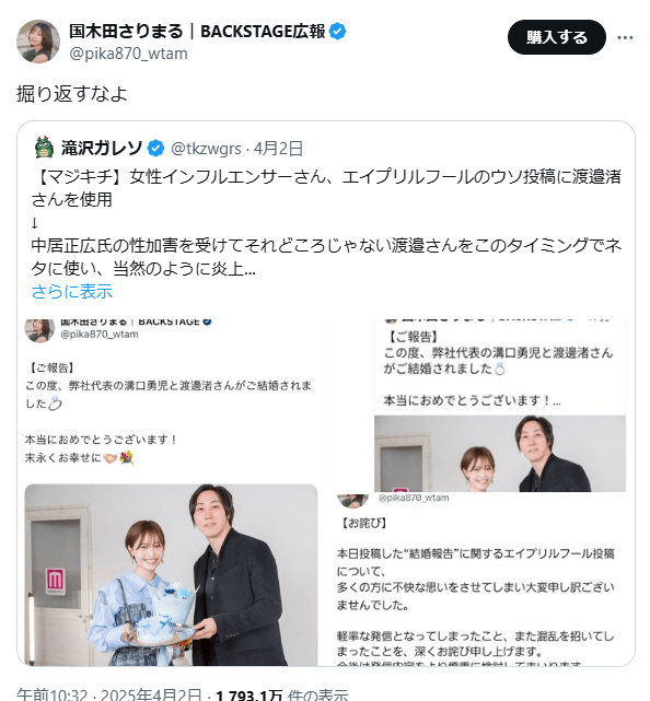 2025年4月1日、国木田氏は自身のX(旧Twitter)に「BreakingDown」のCOOである溝口勇児氏と、元フジテレビアナウンサーの渡邊渚氏が「結婚した」というエイプリルフールネタの投稿を行いました。