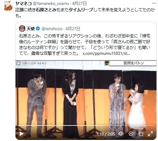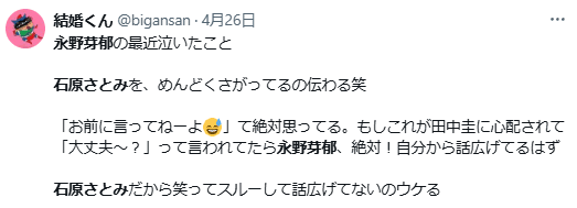 - 4月24日以降:SNS上で過去の舞台挨拶映像(永野芽郁×石原さとみ)が掘り返され、「意味深だ」と話題に。